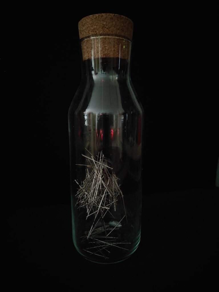 La paja en el aguijar» es una obra de arte moderno que desafía la percepción tradicional del espacio y la materia. La pieza central es una simple paja, un objeto cotidiano y frágil, que está rodeada por múltiples alfileres suspendidos en un cable invisible. La paja, con su aparente simplicidad, representa la vulnerabilidad y la insignificancia percibida del yo en el vasto campo del arte. Poesía