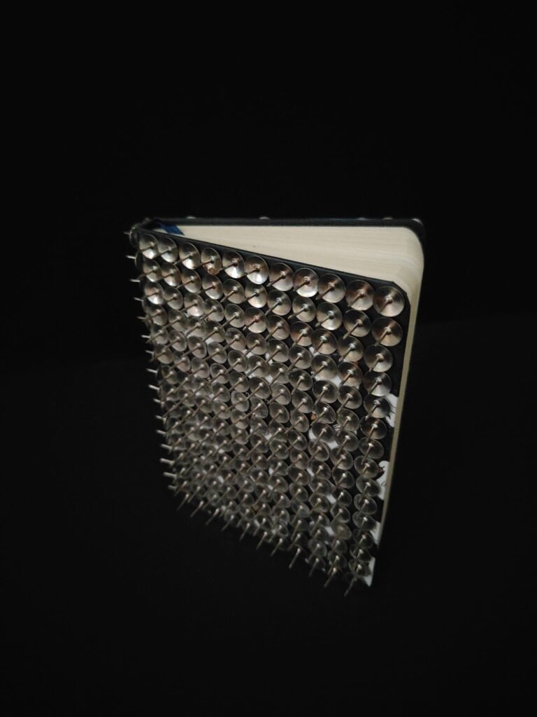 Bestheller» es una provocativa obra de arte moderno y abstracto que emplea un libro cubierto por chinchetas para expresar una crítica incisiva tanto al sector editorial como a los lectores contemporáneos. El libro, objeto central de la instalación, está completamente recubierto por chinchetas metálicas afiladas, lo que hace imposible tocarlo sin lastimarse. Poesía