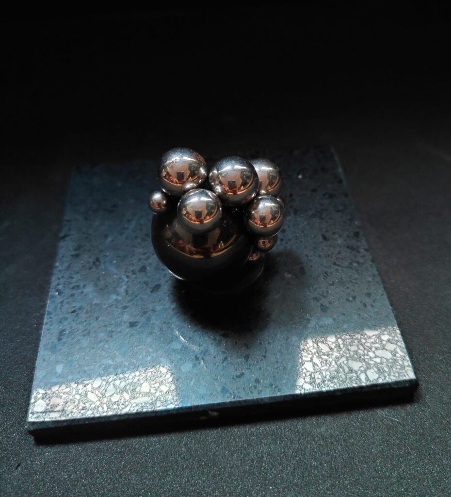 Esporas» es una obra de arte moderno y abstracto que utiliza materiales como mármol, rodamientos imantados, y hematita o imanes comunes para crear una serie de esferas metálicas que parecen flotar sobre la superficie. La pieza busca adentrar al espectador en mundos internos, fríos y metálicos, donde la visualización de las esferas refleja al observador y lo invita a explorar su propio ser a través de estas pequeñas cápsulas simbólicas. Poesía